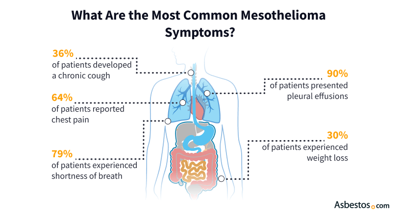 Pleural mesothelioma, which accounts for most mesothelioma cases, starts in the protective lining around the outside of the lungs (pleura). Pleural effusion, or fluid buildup around the lungs, is one of the most common and earliest symptoms of pleural mesothelioma. Some other early signs are a dry cough and shortness of breath.