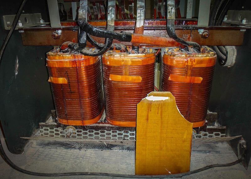 Black asbestos wrap insulation covers cables on these transformers. An asbestos-containing heat panel is in the foreground.