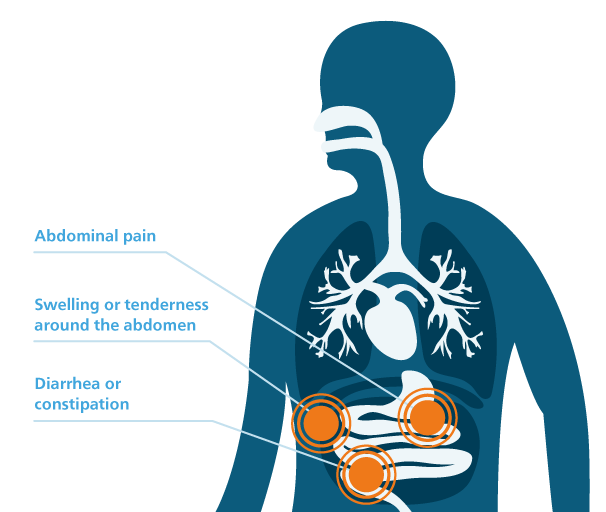 Beginning symptoms of peritoneal mesothelioma include abdominal pain, swelling or tenderness around the abdomen, diarrhea and constipation.